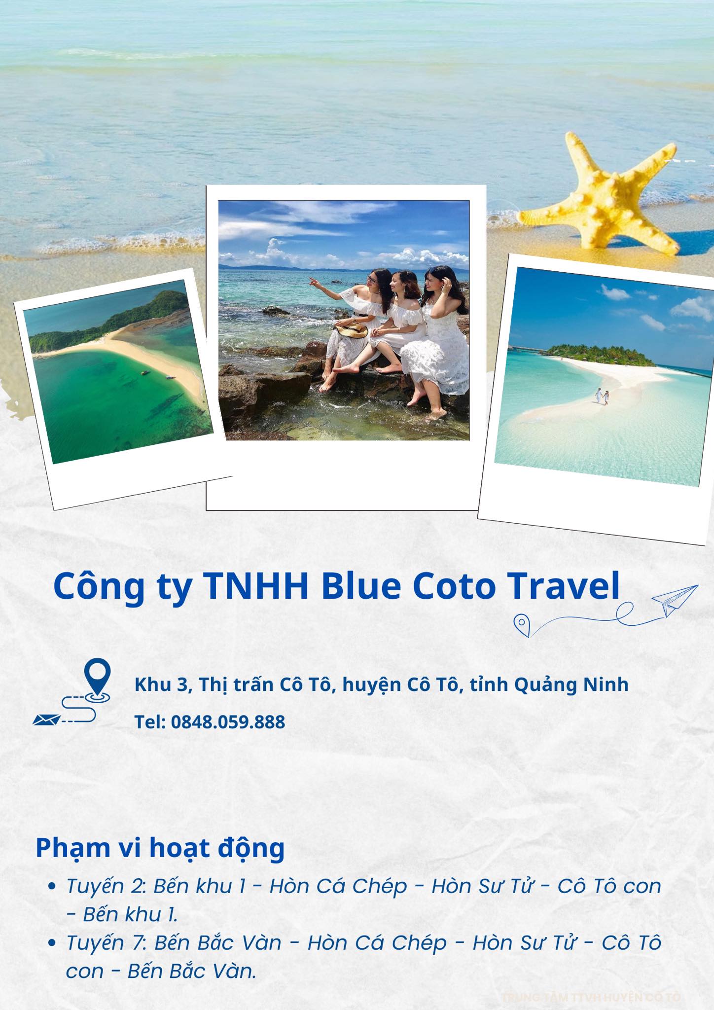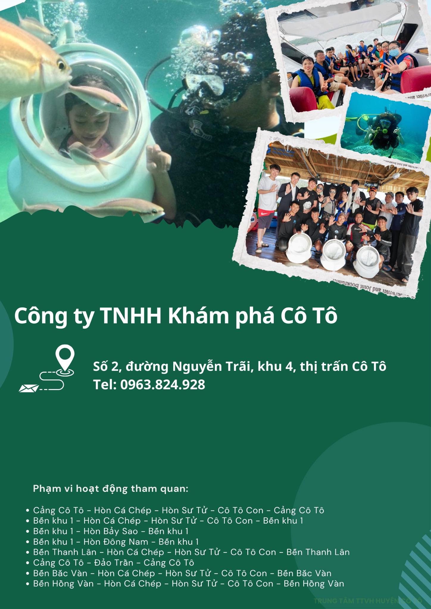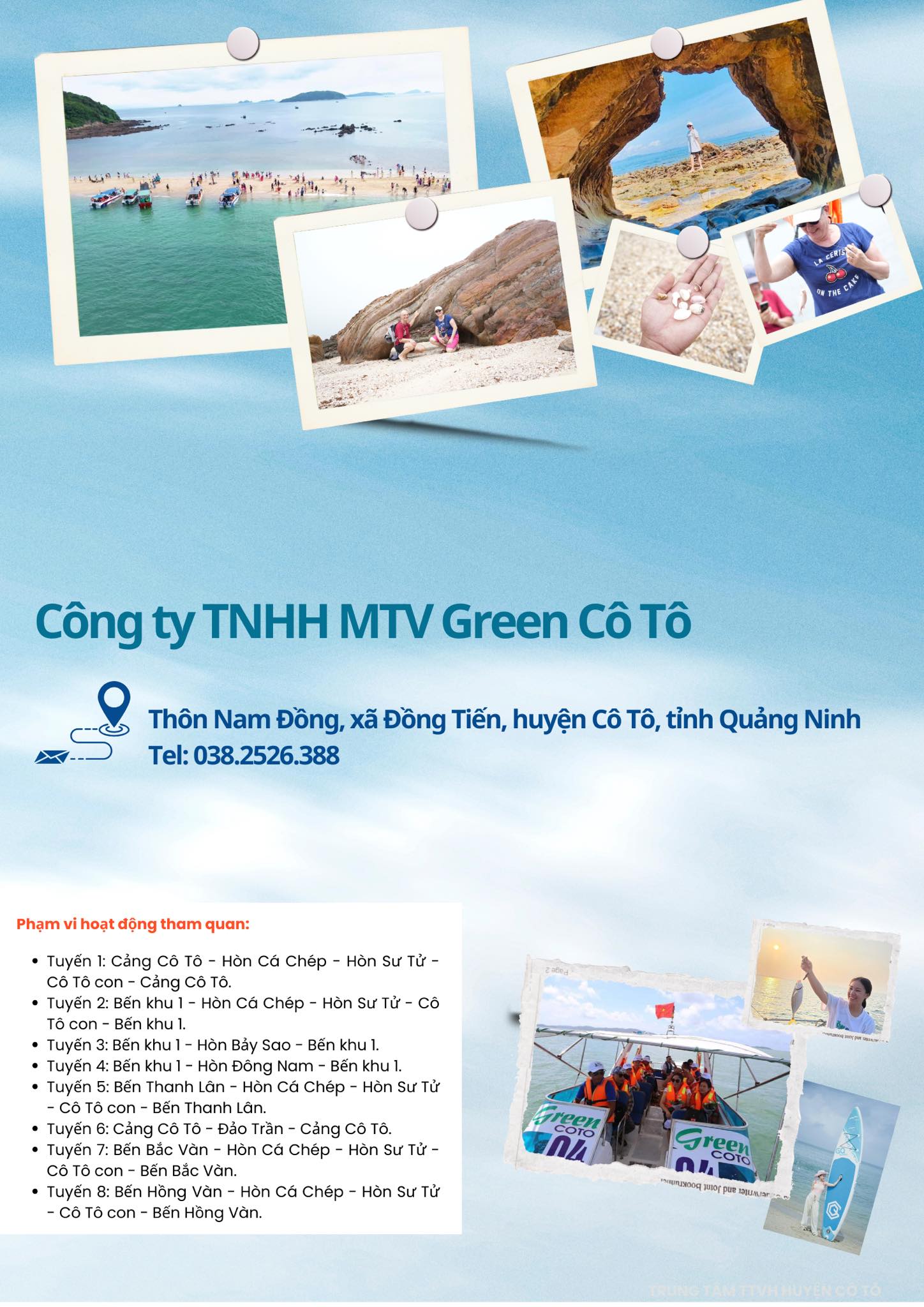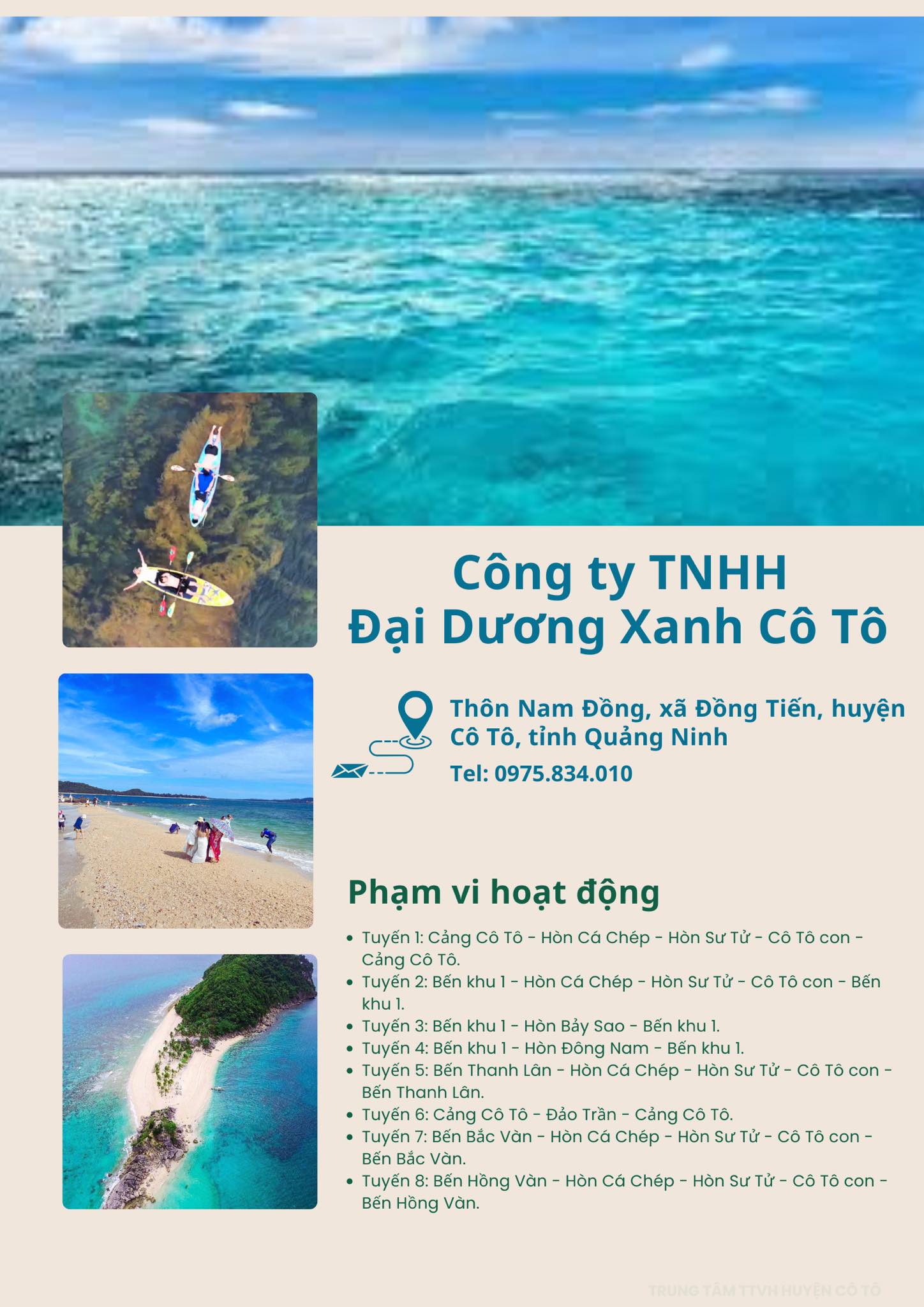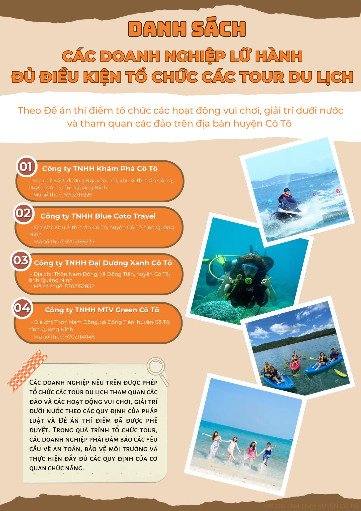 Ủy ban nhân dân huyện Cô Tô công bố danh sách các doanh nghiệp lữ hành trên địa bàn huyện đủ điều kiện tổ chức các tour du lịch theo Đề án thí điểm tổ chức các hoạt động vui chơi, giải trí dưới nước và tham quan các đảo trên địa bàn huyện Cô Tô.