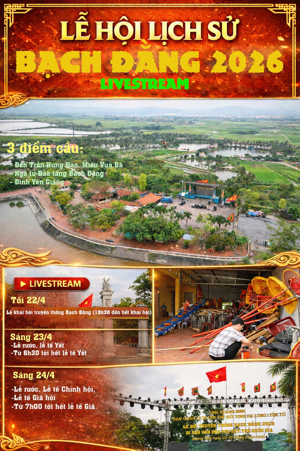 Đặc biệt, để phục vụ đông đảo người dân và du khách theo dõi sự kiện, lễ hội năm nay sẽ được truyền hình trực tiếp tại 3 điểm cầu gồm khu vực đền Trần Hưng Đạo – Miếu Vua Bà, ngã tư Bảo tàng Bạch Đằng và đình Yên Giang. Các khung giờ phát sóng nổi bật gồm tối 22/4 với chương trình khai mạc; sáng 23/4 với lễ rước và lễ tế Yết; sáng 24/4 với lễ rước cùng Đại lễ tế Chính hội.
