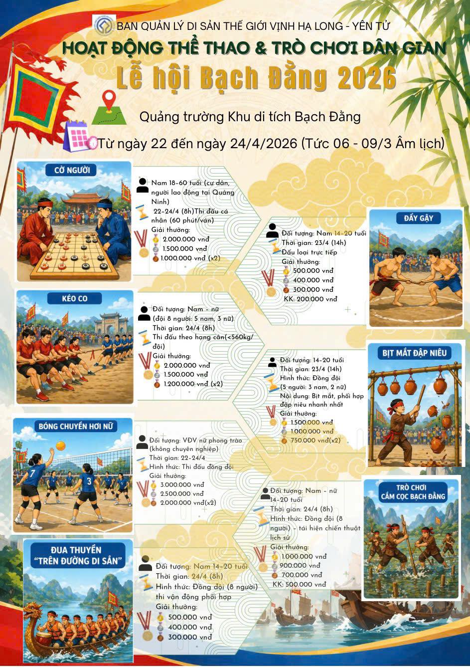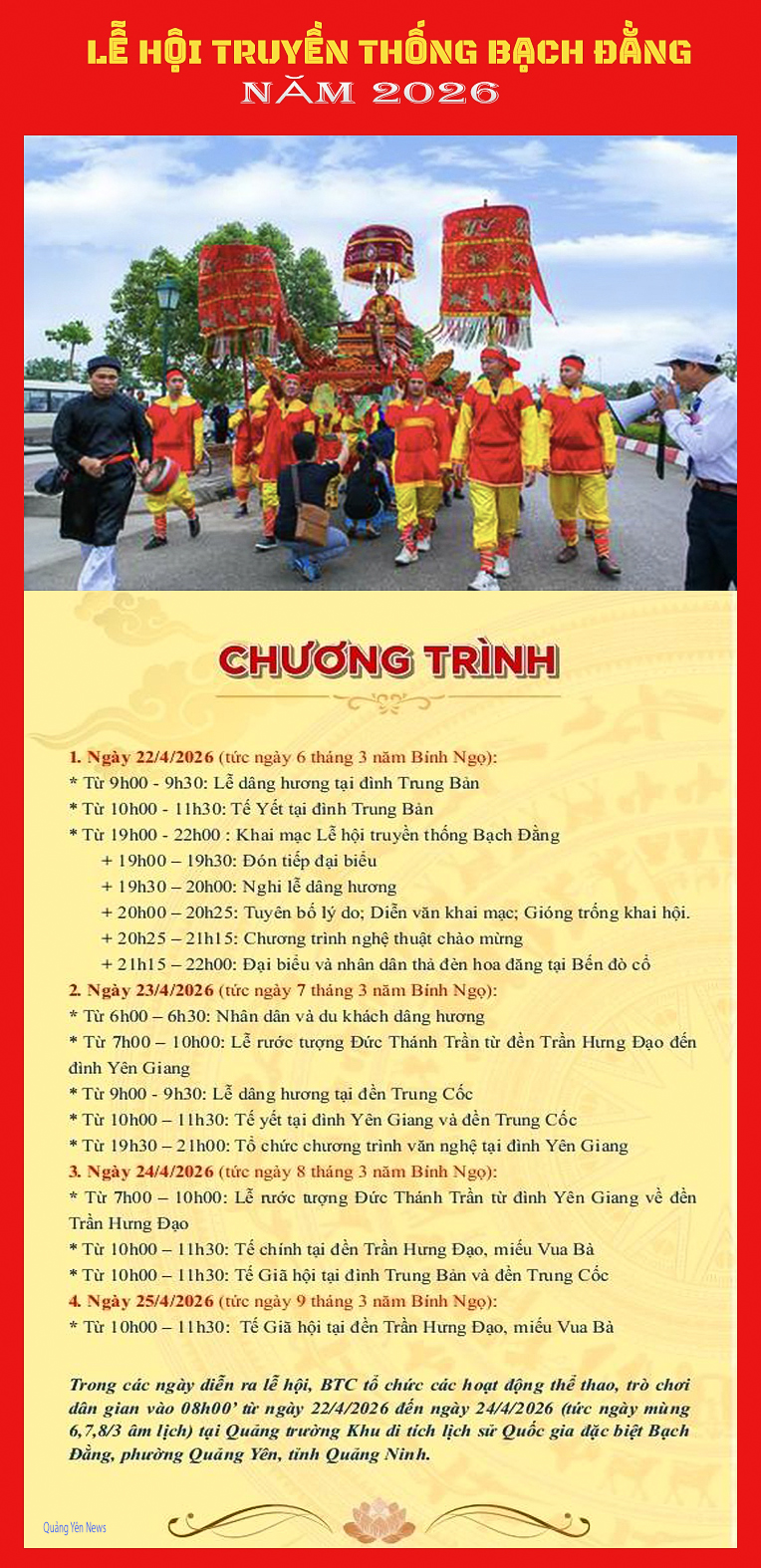 Từ ngày 22 đến 25/4/2026 (tức ngày 06 đến 09 tháng 3 năm Bính Ngọ), Lễ hội truyền thống Bạch Đằng năm 2026 sẽ diễn ra tại Khu di tích Quốc gia đặc biệt Bạch Đằng. Đây là sự kiện văn hóa – tâm linh tiêu biểu của tỉnh Quảng Ninh, đồng thời là Di sản Văn hóa Phi vật thể Quốc gia, mang đậm ý nghĩa lịch sử và tinh thần tri ân sâu sắc.