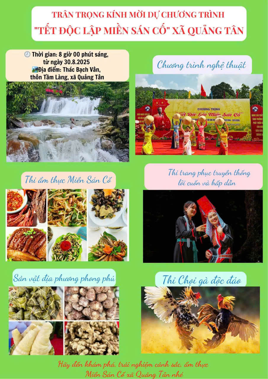 Ngày 30/8 tới, tại Thác Bạch Vân (thôn Tầm Làng, xã Quảng Tân), sự kiện “Tết Độc Lập miền Sán Cố” sẽ chính thức diễn ra, hứa hẹn mang đến cho du khách một không gian văn hóa đặc sắc, đậm đà bản sắc vùng cao.