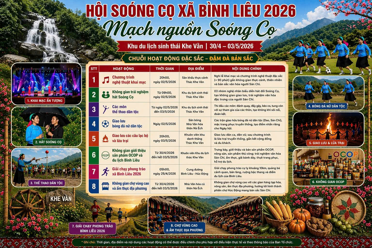 Từ ngày 30/4 đến hết ngày 03/5/2026, Hội Soóng Cọ Bình Liêu năm 2026 sẽ chính thức diễn ra tại Khu du lịch sinh thái Khe Vằn cùng một số địa điểm phụ trợ trên địa bàn xã Bình Liêu, tỉnh Quảng Ninh. Với chủ đề “Mạch nguồn Soóng Cọ”, sự kiện hứa hẹn mang đến không gian văn hóa đặc sắc, góp phần làm phong phú chuỗi hoạt động chào mừng kỳ nghỉ lễ 30/4 và 1/5, đồng thời tạo điểm nhấn thu hút du khách đến với vùng biên cương Đông Bắc của Tổ quốc.